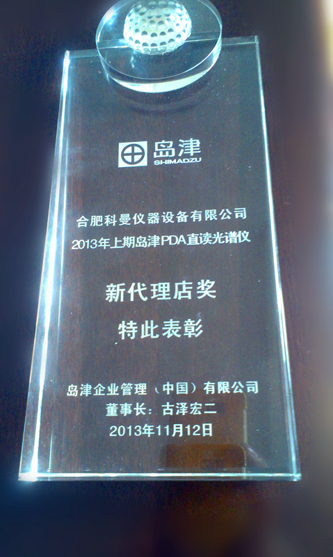 經過全體員工的團結努力,圓滿完成瞭(le)島津産(chǎn)品銷售的任務,在11月的島津代理商全體會議上,島津董事長古澤宏二先生給予合肥科曼儀器有限公司島津“新代理店獎”的表彰。...